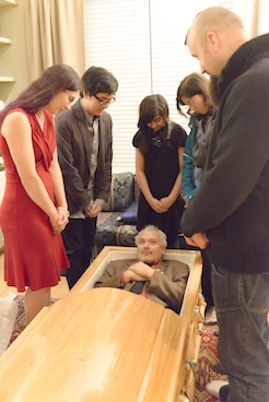 Awake is available on the GoPano website where the films of each room can be viewed. I recommend viewing them on an iPad–more than one if possible–as the video rotates as one moves the iPad. The project has typically been displayed as an installation, using five iPads set up across a house or room. Each iPad displays a room as characters move in and out.